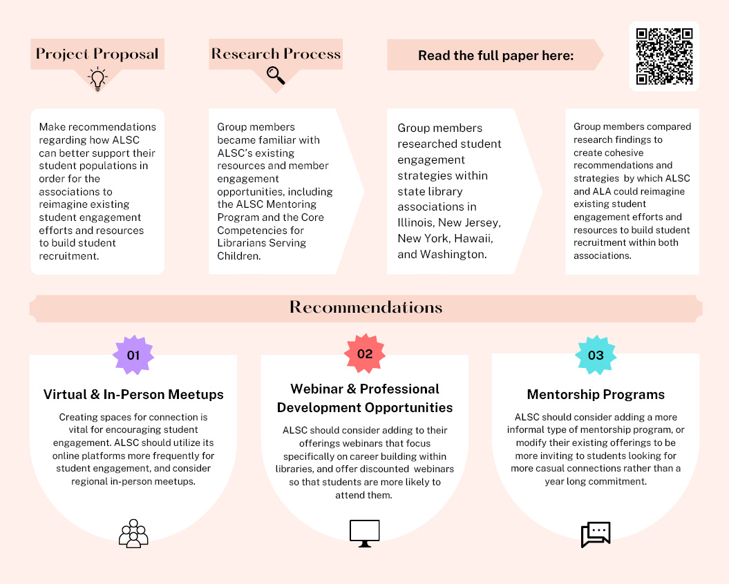 Four members of the 2022 EL class—Megan Jackson, Hyunjin Han, Ashley Bressingham, and Ewa Wojciechowska, also known as Team K, worked on Welcoming and Engaging Students in ALSC and Children’s Services (see infographic).