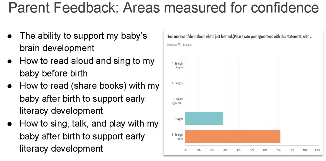 All Pilot 1 and 2 parents (100 percent) surveyed (n=37) agreed that they learned and increased their confidence regarding supporting their baby’s early literacy development (before and after birth) by participating in the Ready to Hatch workshop.