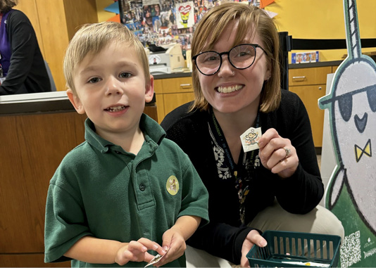 Tulsa City-County Library Children's Associate Angela Martinez gives a sticker to her storytime regular Ryker.