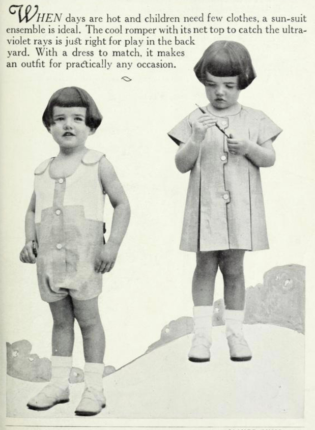 Building on this emphasis on durable, comfortable clothing, the Bureau incorporated scientific research to prioritize children’s health. Studies showing that exposure to the sun’s ultraviolet rays prevents and treats rickets—a condition most often caused by a vitamin D deficiency—inspired the creation of the sunsuit, designed to expose sufficient skin to sunlight.26 The Bureau also favored cotton for its softness and breathability, minimizing irritation to children’s sensitive skin.27 These health-conscious designs ensured garments supported both physical well-being and practical use.