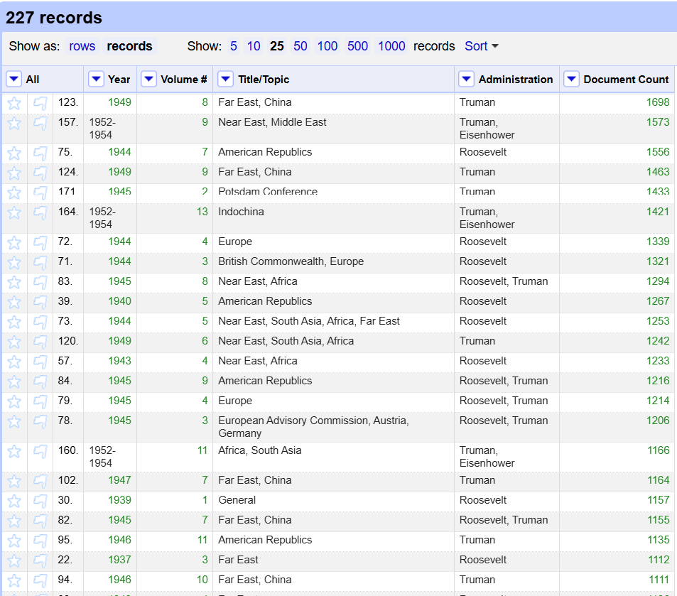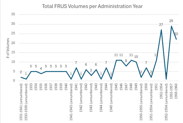 The FRUS archives reached a uniform, topical organization system in 1933, so this study begins its dataset there and continues through the end of the Eisenhower presidency in 1960. This creates roughly thirty years of data to analyze without encroaching on the Kennedy assassination or simply getting too big for a single researcher to manage. The chosen dataset includes each title, the year(s) covered, the presidential administration, the volume number within the series, and the total document count. All characters and numbers in the dataset are listed exactly as written on the FRUS online archive. This was all fed into a spreadsheet, which could then compare descriptive data to the item’s size. In other words, this report could determine how prolific a given administration, topic, or year was, based on how many FRUS documents were associated with it. The volume number within the series also creates a ranking system from “first published” down to “most recently published.” The study hoped to find a trend in what topics get published first from each administration and if there is any evidence to suggest why those titles roll out before the others.