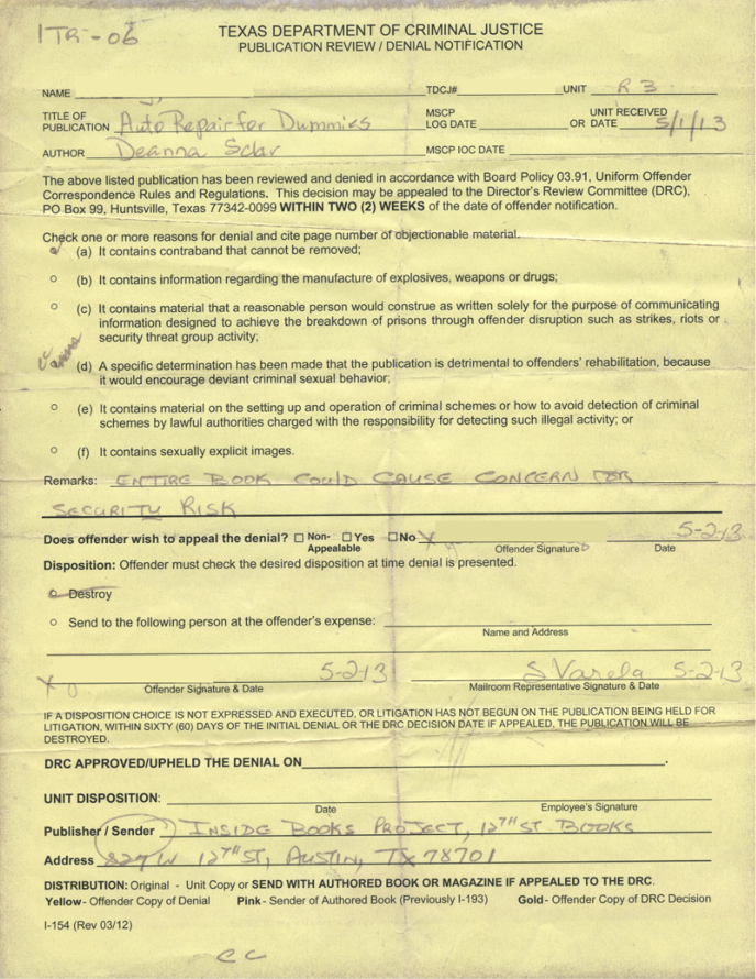 Figure 1. A Texas Department of Criminal Justice publication review/denial notification for Auto Repair for Dummies by Deanna Sclar.