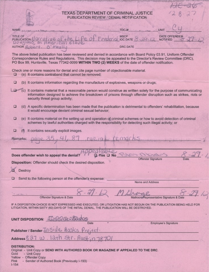 4. Publication Review/Denial Notification for, TDCJ Censorship Collection, Narrative of the life of Frederick Douglass, an American Slave, by Frederick Douglass, Inside Books Project Archive, 19 August 2012, https://ibparchive.texasafterviolence.org/files/original/1201dfc25ae2faf7cd0e5f6e8ac6cf75.jpg.