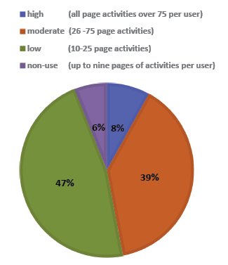 Figure 7 shows the breakdown by level of e-book use. Despite the criteria and rubric established, use is hard to completely assess. Page views may also have meant flipping back and forth where use is not linear but may be sustained. This analysis revealed that most of the titles saw low (47 percent) to moderate (39 percent) use: combined low and moderate use totals 86 percent of the 385 unique titles. High use was 8 percent and 6 percent were used minimally and were categorized as nonuse. For a significant percentage of the titles (moderate and high use totaled 47 percent), users may have been reading full chapters per book if one assumes page views are generally consecutive. By carefully analyzing the level of e-book use in this study, we identified deep reading, consecutive reading, sampling of text to retrieve data or text, or sampling to determine no further use as needed. All represent a variety of what may be expected when examining how users use e-books.