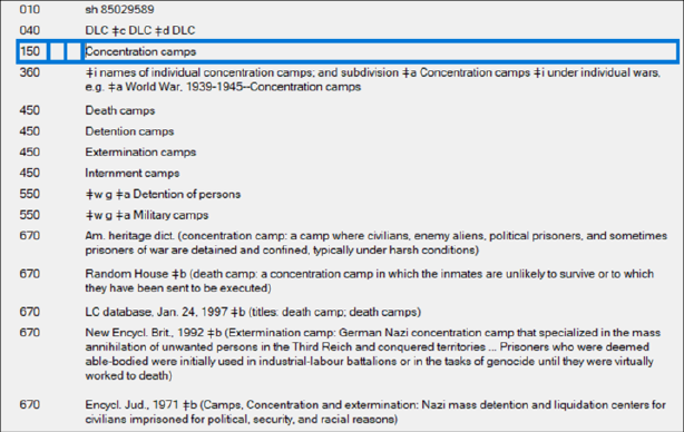 - 450 #1: Concentration camps was assigned as a cross reference; the subfield code (“$w nne”) indicates that this term had been a previously authorized RDA access point and a valid LCSH subject heading;