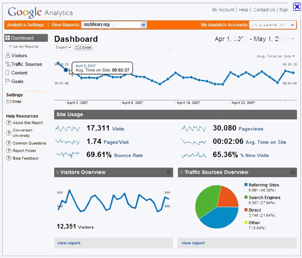 In his book Advanced Web Metrics with Google Analytics, Brian Clifton identifies initial visitor data that will give you a baseline as you begin to understand your traffic, your users, and potential concerns. Looking at these numbers will start to show you how and by whom your library's website is being used. A hands-on review of these first-level metrics inside your own GA account will also provide you with an excellent introduction and practice for navigating the GA interface, and through this practice you will begin to discover the many options of the program.