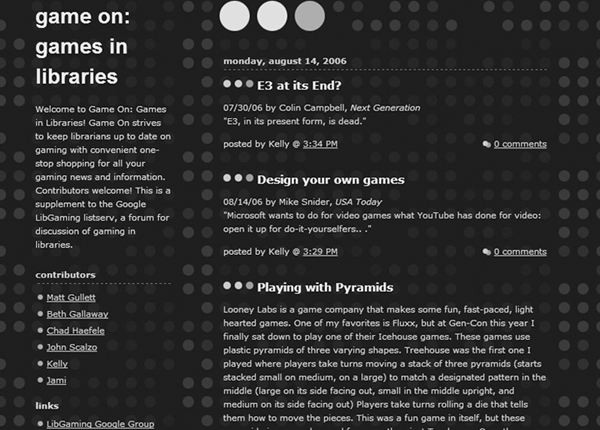 The Game On: Gaming in the Library blog (http://libgaming.blogspot.com), founded and administered by Beth Gallaway, features frequent contributions from Gallaway, Kelly Czarnecki, and Jami Schwarzwalder. Occasional contributors include Matt Gullett, Chad Haefele, and John Scalzo. Gallaway is also writing a book on gaming and libraries (Game On: Gaming at the Library, available 2007 from Neal-Schuman). |