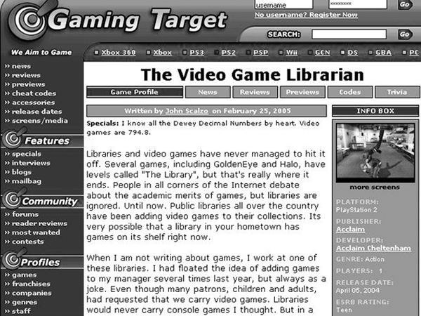 In addition, there are many different gaming-related services libraries can offer patrons. The most obvious one is to collect and circulate games to patrons. There is an increasing number of resources to help those librarians who want to offer this type of service. One of the first and, in my opinion, still one of the best resources for collection development of video games is John Scalzo's Video Game Librarian series for the Gaming Target Web site (see figure 2).4 Scalzo works at a public library, and in these columns he discusses his approach to collection development, his process for implementation, as well as tips, suggestions, and explanations. A list of libraries that circulate games is available at libsuccess.org/index.php?title=Gaming#Libraries_Circulating_Games.