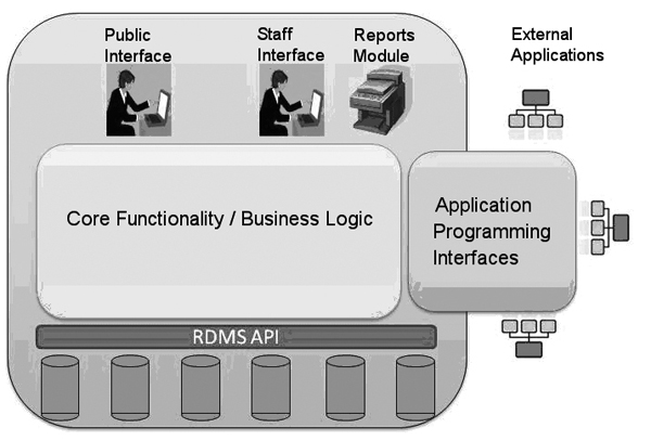 As software applications have evolved from monolithic proprietary designs to structured layered architectures, it has become common to use application programming interfaces internally. Figure 4 illustrates an ILS where the staff and public user interfaces as well as the reporting module do not access the business logic of the application through proprietary programming but only through the services made available through an application programming interface. This tiered approach has come into favor in recent years and is consistent with the service-oriented architecture. As applied internally within the application, having a presentation layer interfaces operate through a set of APIs to gain access to the underlying functionality and business logic provides many advantages, including the ability to rework user interfaces without having to reprogram the entire application.