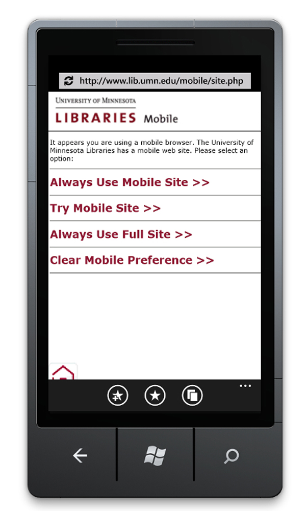 The University of Minnesota Libraries’ mobile site allows users to set a preference for the mobile site or the full site. |