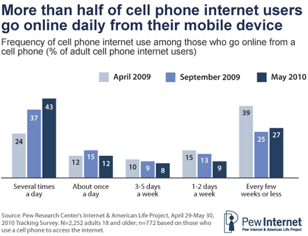 According to Pew, more than half of cell phone Internet users go online daily from their mobile device. |
