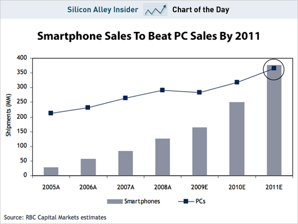 Smartphone sales are poised to overtake PC sales (Original image: Dan Frommer, “Chart of the Day: Smartphone Sales to Beat PC Sales by 2011,” Business Insider website, Aug. 21, 2009, www.businessinsider.com/chart-of-the-day-smartphone-sales-to-beat-pc-sales-by-2011-2009-8 [accessed Jan. 4, 2011]). |