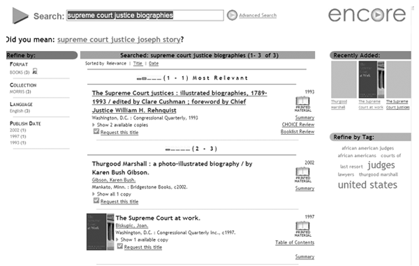 When displaying search results, Encore divides its interface into three columns. A wide column in the middle displays the results gathered so far. A narrow column on the left provides links for faceted navigation. A narrow column on the right provides additional features, such as highlighting featured resources, a tag cloud, and federated-search results (see figure 8).