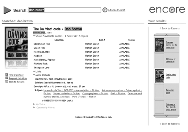 Encore represents the effort of Innovative Interfaces to produce a next-generation library interface, which the company positions as a new “discovery and services platform.” Encore embraces a more expansive view of its scope than a traditional catalog. Innovative first announced its plan to create Encore in June 2006, though work was already in progress. The company has followed an ambitious development strategy, with production release of the product expected in mid-2007.1