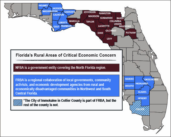 Two such projects were funded to build out middle mile infrastructure to rural Florida counties: the North Florida Broadband Authority (NFBA) received funding to build a middle mile network in the North Central Rural Areas of Critical Economic Concern (RACEC),12 and the Florida Rural Broadband Alliance received funding to build a middle mile network in the Northwest and South Central RACECs (figure 3.1). Both the NFBA and FRBA contracted with the Information Use Management and Policy Institute (Information Institute) at the Florida State University College of Communication and Information to conduct broadband needs assessments of rural anchor institutions in Florida's three RACECs.