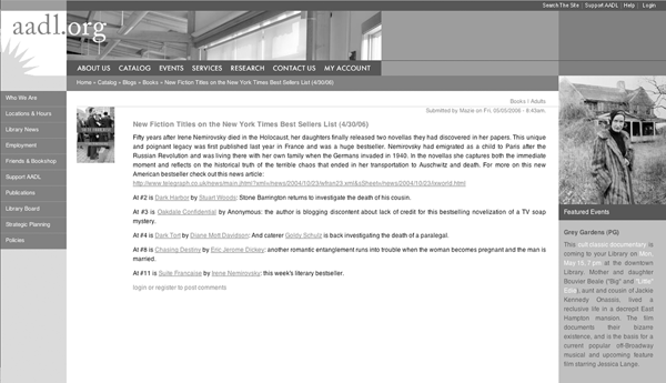 In June 2006, the Ann Arbor District Library Web site, which is all blog-based, garnered the “Best of Show” winner slot (Web Page/Home Page, $6 million+ category) in the annual Best of Show competition sponsored by the Library Administration and Management Association (LAMA). |