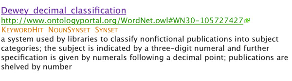 DBpedia Spotlight is an application that helps you annotate texts with DBpedia elements and term lists. You can download the software or use an online form to provide the text you wish Spotlight to annotate. For each term that matches a concept or term in DBpedia, the tool gives a list of possible matches. For example, the term library in a text gives a number of proper names including the term, but also offers a choice between library and library (computing). You can narrow down your choices by selecting one or more categories from DBpedia, Freebase, or Schema.org.