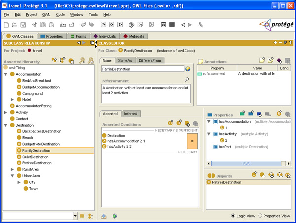 Protégé (figure 5.1) is the software most frequently cited for the creation and editing of metadata definition files using OWL. It was developed at the Stanford Center for Biomedical Informatics Research and was supported by grants by a number of research and scientific agencies including National Institutes of Health and the National Library of Medicine. Protégé provides an interface that displays the relationships between classes and subclasses and between elements. It allows for editing of metadata elements without the barrier of code. It is not unlike some commonly used XML editors in its functionality, but instead of XML the underlying data is in OWL and RDF.