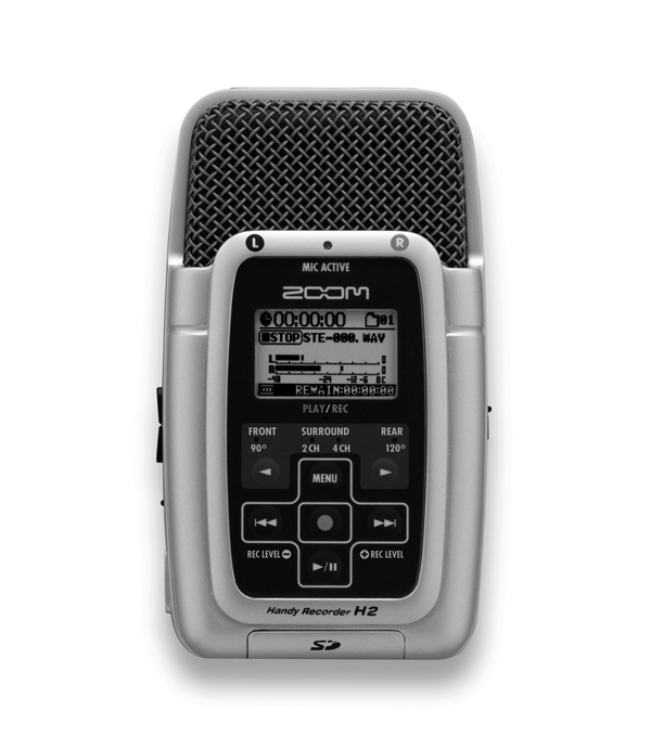As a recorder, the Zoom H2 can be either battery-powered or plugged into the wall. It will record in a variety of formats and qualities, from low-quality 64 Kbps MP3 all the way up to lossless WAV, and it takes a standard SD card for storage, so that you'll never run out of space. It has four microphone capsules inside and can be set anywhere from standard stereo recording all the way up to 360 degree capture, which allows for the files to be converted to 5.1 Surround. The microphones in the Zoom H2 sound great, capturing voices and instruments equally well. It can run for hours on a single set of batteries, and operating it is simple—you just use a directional pad on the front of the H2. Recording is even easier, once you've got your settings the way you like them, as there's a big red button on the front that starts and stops recording.