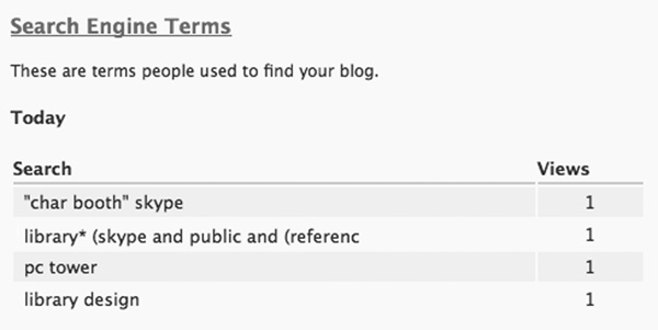 I have written this LTR for many reasons, but primarily in response to persistent curiosity about VoIP tools in library contexts: people find my blog (info-mational) several times a day by searching for “Skype in libraries” or “video reference” (figure 3). I also wanted to evaluate the assumptions I once made about Web voice and video, and carry my experience with this specific platform through productivity instead of ditching out at inflated expectations. This amounts to a personal exercise in technology literacy, an opportunity to learn deeply about the communication tools I not only take for granted in my working and personal life, but that I once held in irrationally high regard.