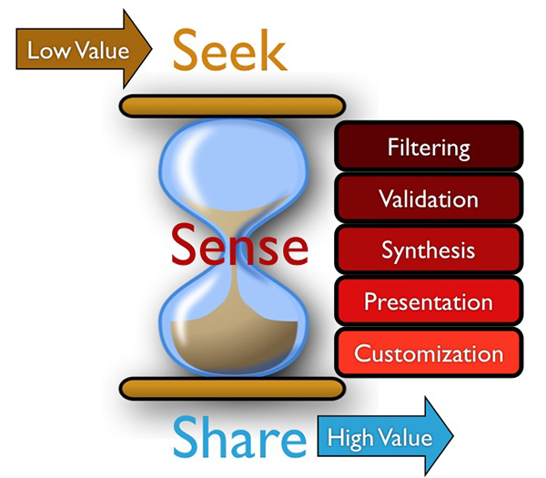 Sense is the hardest of the tasks. If you’re not doing anything, then it’s not real sense making. It’s the effort that makes a difference. It’s how we personalize information and use it. For me it’s blogging. It’s the effort of writing stuff and putting it out there. I recently decided to do a compilation of the best of. There are many ways to approach sense making. Robin Good is one of the few people who uses Scoop.it really well. Every single time he adds something, he adds his own commentary. I get hundreds of Scoop.it pingbacks on my blog, and they automatically go into spam because 99%, if not more, have absolutely no value to them. It’s about reflecting. Putting into practice what you’ve learned. PKM is adding value. If you’re not adding value, then don’t go to the third step, which is share.