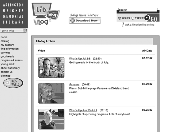 Arlington Heights Memorial Library is one of just a handful of libraries providing a videoblog, which was established in December 2006. Videos of programs, “what's new” segments, and interviews with AHML librarians discussing gift ideas, virtual reference, and ESL resources have been posted in the last few months. I interviewed Ingrid Lebolt, the library's Web services director, on May 16, 2007, to find out more.
