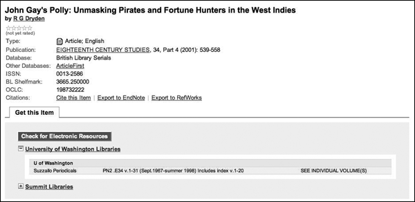 First, notice that because the resource is an article, the Check for Electronic Resources button is displayed. Clicking on this link will send the session over to our link resolver, where full-text links are correctly served. In addition, notice that WorldCat Local has also retrieved and displayed our print holdings for the journal title. However, our print holdings only go to 1998, and the article was published in 2001. Until we load MARC-formatted detailed holdings data for this journal and OCLC checks article date against holdings date (a planned enhancement), article citations will always include a display of our print holdings, whether or not we own the specific issue in which the article appears. In future, print holdings will appear only in article displays where both ISSN and date match.