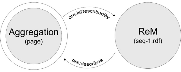 In figure 4, we see an Aggregation that is a page of a newspaper from the NDNP and its Resource Map, which has been serialized into an RDF/XML file (seq-1.rdf) that can be downloaded from a webserver. ORE requires that a Resource Map express its relationship to the Aggregation (ore:describes), and the subject of this triple must be the URI of the Resource Map. The pattern of these triples (e.g., “The Resource Map describes the Aggregation”) will begin to sound familiar as you read these graphs and they are repeated over and over again.