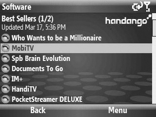 Cell phones and handsets of all types come prepackaged with some mobile applications or games installed. But phone owners needn't limit themselves to those programs, as there are thousands of applications available for their devices. Most mobile phone carriers offer a variety of apps for purchase through their Web sites and will often create a shortcut for subscribers to navigate directly there on their phones. And there is no shortage of other Web sites and services offering similar mobile shopping experiences. Handango (see figure 11) offers thousands of mobile software applications, games, and utilities for purchase, such as office and printing programs, adventure games, cookbooks, mobile TV and radio programs, and championship chess. Handmark, makers of the Pocket Express travel software, has a large selection of games, such as Galaga, and programs such as virtual wallets and password managers. The C|NET Download Web site offers over 6,000 free or free-to-try mobile software programs for device owners to nab, such as Adobe Acrobat Reader, a WiFi hotspot finder, and a ringtone maker.