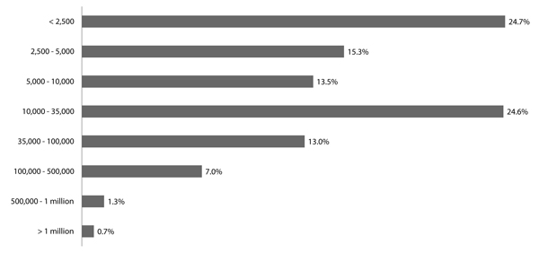 There were 1,266 participants who completed a portion of the Library Website Survey (LWS) with a completion rate of 79.6 percent or 1,016 respondents. User population varied greatly among respondents. The two largest groups of respondents had either a population of fewer than 2,500 users (24.7 percent) or a population of 10,000–35,000 users (24.6 percent). More than three-quarters (76.9 percent) of responding libraries were public libraries, while only 23.1 percent were academic libraries. Of those public libraries, more than two-thirds (69.9 percent) were rural libraries. Of the 331 academic libraries who answered the survey, 48.3 percent were private institutions and 51.7 percent were public institutions (see figure 1).