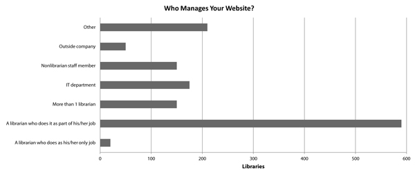 Most library websites appear to be managed by a librarian as part of his or her job (50.0 percent). The next largest group was the “other” category (18.4 percent) that included volunteers, state libraries, or committees.