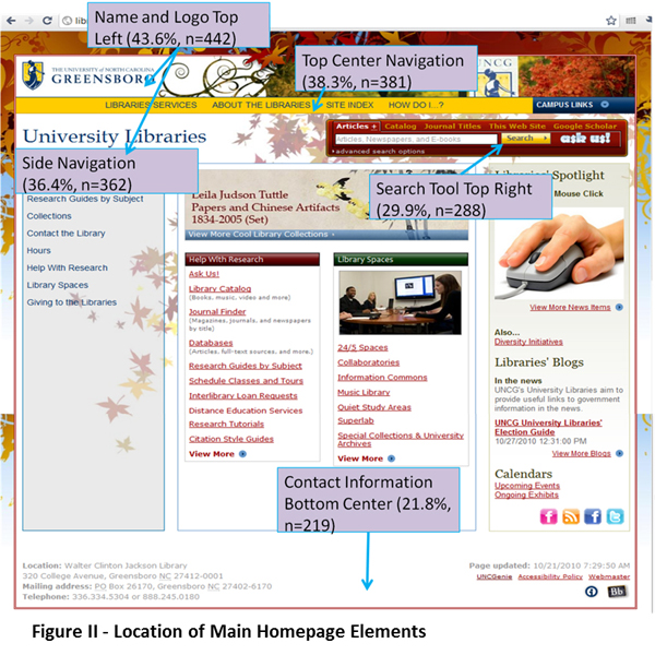 There was a high degree of agreement in homepage design elements found between library responses and researcher evaluations. Main navigation was located at the top center (38.4 percent) or left side (36.3 percent) of the page. Surprisingly 37.8 percent reported not having a search feature available on the homepage, and 30 percent of search tools were located at the top right of the page. Library names and logos were located either at the top center (45.4 percent) or top left (43.3 percent) of the page. Locations of library contact information was the most varied as the majority were found at the bottom center of the homepage (21.6 percent), followed by not at all (16.2 percent), top center, side left, top right, and the center of the page. Library location information, such as address and directions, were either not present (21.4 percent) or located predominately at the bottom center (18.7 percent) or top center (15.3 percent) of the page.