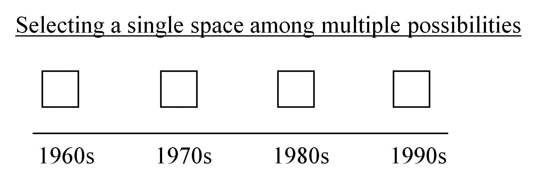 Similar to regional space, the horizontal specificity on time space deals with the designation of a single space among many different spaces. For instance, the answer to the question “What was the name of the US helicopter pilot shot down over North Korea?” can reflect more than one time space in a horizontal continuum (see figure 5.2).